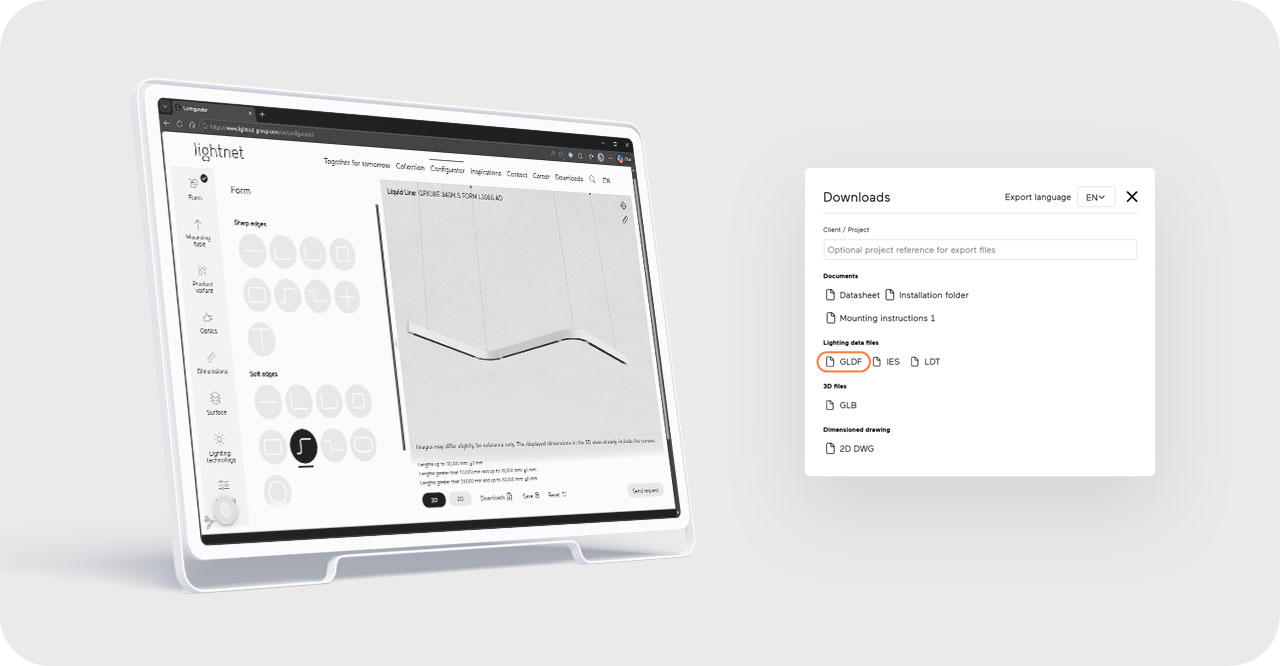 Planer konfigurieren die Leuchte auf eurer Website und übernehmen sie direkt in DIALux. Die passende Datei wird automatisch erstellt, heruntergalden und per Drag and Drop sofort ins Projekt eingesetzt.