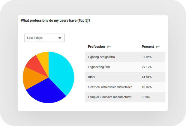 Ihr erhaltet Einblicke in die Nutzung eurer Produkte in DIALux und seht, von welchen Nutzergruppen sie geplant werden und in welchen Projekten sie zum Einsatz kommen.