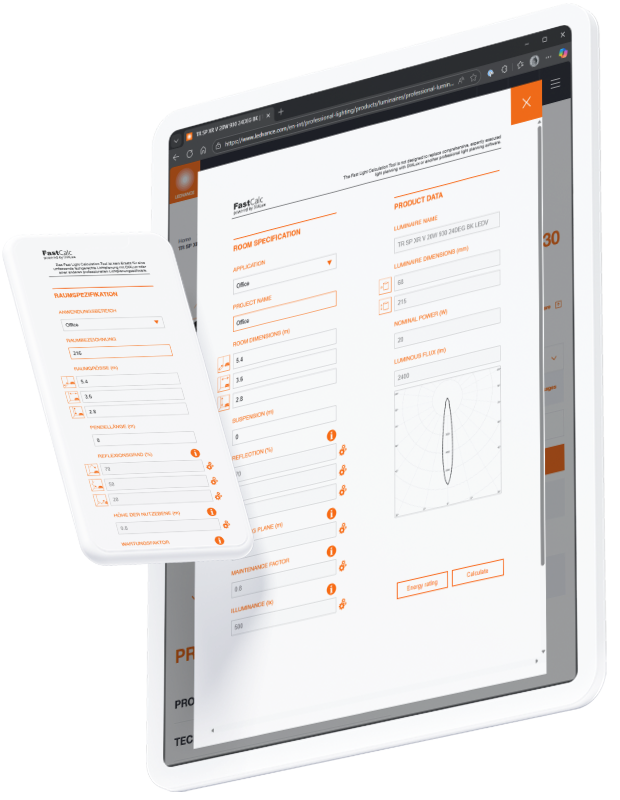Give your users fast results for their lighting calculations with your luminaires. We bring FastCalc to your website, cleanly integrated and tailored to your design.